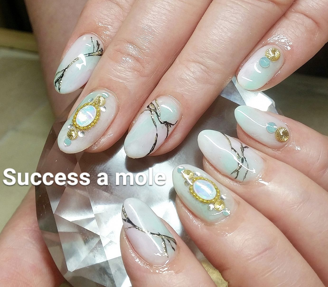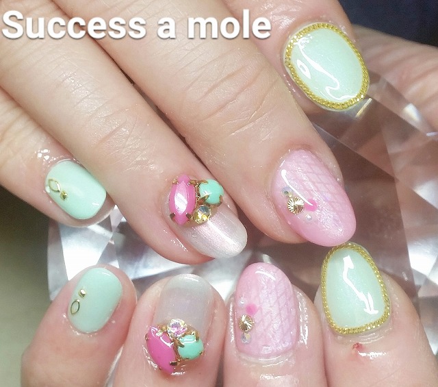 - 桜ラメグラデーションネイル、天然石桜ネイル、ペタペタカラーアートネイル、パーツ盛りゴージャスネイル 三ツ境、横浜、ネイルサロン