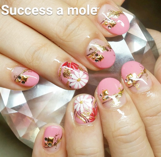 - 立体ミラーネイル、ミラーネイル、モードピンクフラワーネイル、ドライフラワーネイル、逆フレンチ 三ツ境、横浜、ネイル