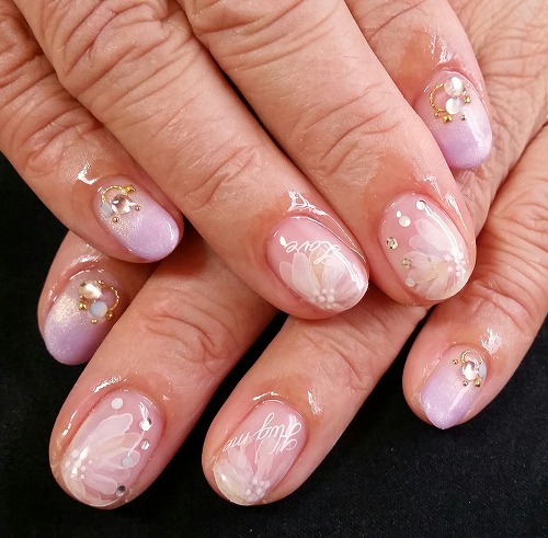 - シースルーフラワーネイル、ハートホログラムネイル、花柄ピンクネイル 横浜ネイルサロン/サクセスアモール/流行ネイル/おすすめ/安い/三ツ境/二俣川