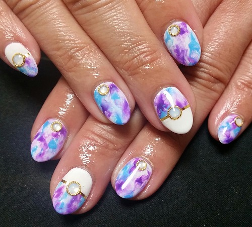 - ブルー&パープルタイダイネイル、ピンクワンカラーハートネイル 横浜ネイルサロン/サクセスアモール/流行ネイル/おすすめ/安い/三ツ境/二俣川